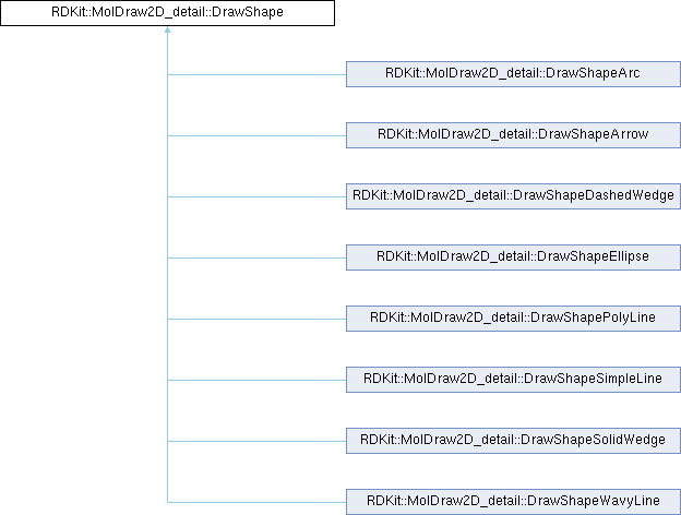 Implemented in RDKit::MolDraw2D_detail::DrawShapeArc, RDKit::MolDraw2D_detail::DrawShapeArrow, RDKit::MolDraw2D_detail::DrawShapeDashedWedge, RDKit::MolDraw2D_detail::DrawShapeEllipse, RDKit::MolDraw2D_detail::DrawShapePolyLine, RDKit::MolDraw2D_detail::DrawShapeSimpleLine, RDKit::MolDraw2D_detail::DrawShapeSolidWedge, and RDKit::MolDraw2D_detail::DrawShapeWavyLine.