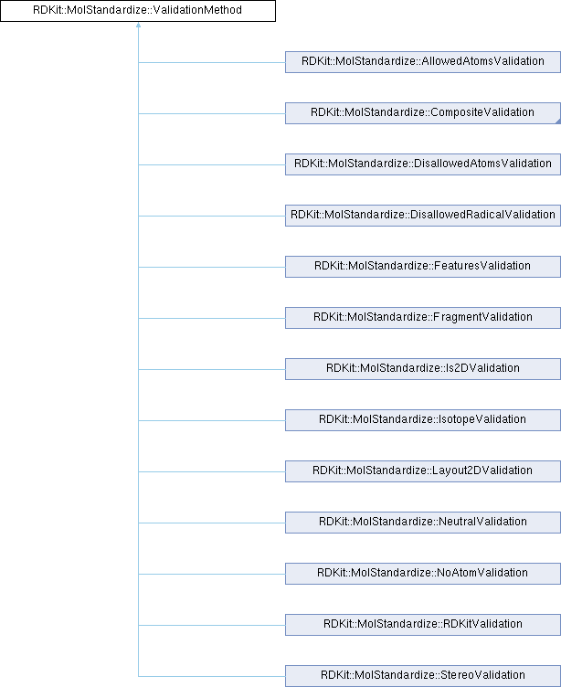Implemented in RDKit::MolStandardize::AllowedAtomsValidation, RDKit::MolStandardize::CompositeValidation, RDKit::MolStandardize::DisallowedAtomsValidation, RDKit::MolStandardize::DisallowedRadicalValidation, RDKit::MolStandardize::FeaturesValidation, RDKit::MolStandardize::FragmentValidation, RDKit::MolStandardize::Is2DValidation, RDKit::MolStandardize::IsotopeValidation, RDKit::MolStandardize::Layout2DValidation, RDKit::MolStandardize::NeutralValidation, RDKit::MolStandardize::NoAtomValidation, RDKit::MolStandardize::RDKitValidation, and RDKit::MolStandardize::StereoValidation.